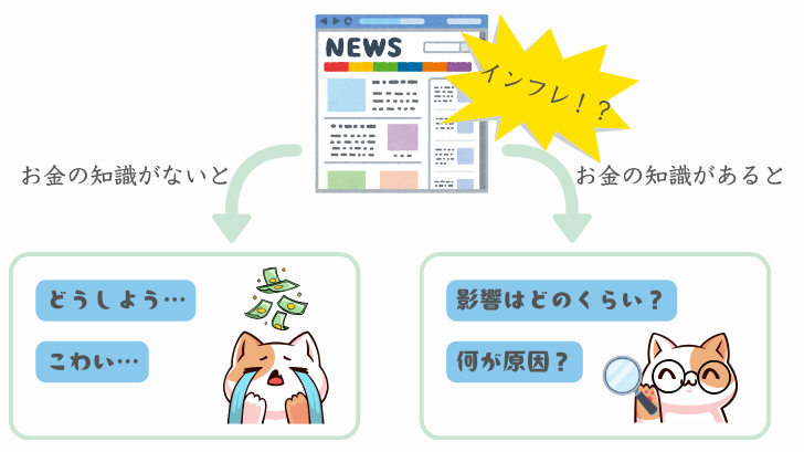 また、経済ニュースを理解していると、例えば「物価が上がっている」というニュースに触れたときでも、「怖い」「どうしよう」と感情的に反応するだけでなく、